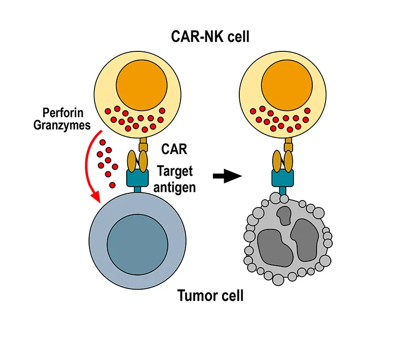 NK cells can quickly and directly kill tumor cells without recognizing tumor-specific antigens, and have a broad-spectrum and efficient anti-tumor effect, which shows a broad prospect in tumor immunotherapy. The CAR-NK cells, as modified by the CAR structure, exhibit stronger targeted killing ability against tumor cells, demonstrating excellent anti-tumor activity for both hematologic and solid tumors.