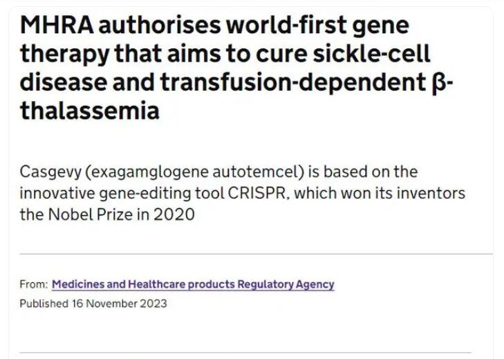 MHRA称,这是全球首个获批治疗该适应症的基因编辑疗法,也是全球首个获批应用“基因剪刀”CRISPR的疗法。CRISPR疗法是2020年诺奖得主Emmanuelle Charpentier和Jennifer Doudna在2012年一篇论文中提出的技术。