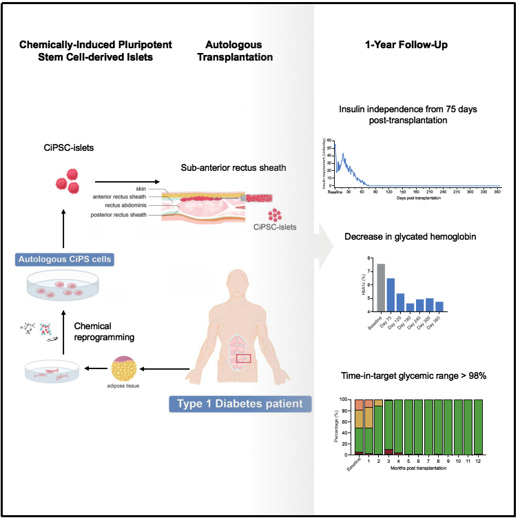 由天津市第一中心医院沈中阳、王树森研究组,北京大学、昌平实验室邓宏魁研究组与杭州瑞普晨创科技有限公司组成的研究团队,利用化学重编程技术诱导多能干细胞制备胰岛细胞,并将其移植给一名1型糖尿病患者,取得了临床功能性治愈的疗效。该成果9月25日晚发表于国际权威期刊《细胞》。