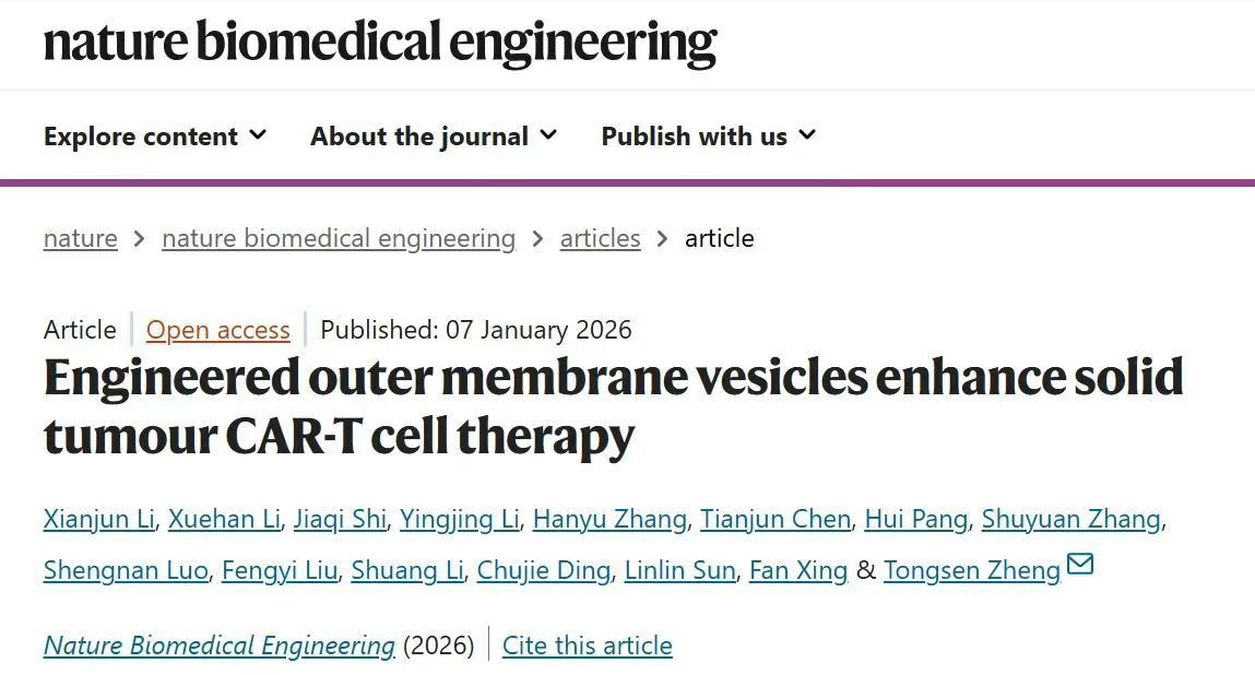 日前,哈尔滨医科大学附属肿瘤医院郑桐森教授团队在实体瘤免疫治疗研究领域取得新进展,相关成果在线发表于国际期刊《自然·生物医学工程》。团队研发的一款基于细菌外膜囊泡(OMV)的新型CAR-T赋能平台(嵌合抗原受体T细胞免疫疗法)——“BROAD-CAR”,不仅能同时解决实体瘤免疫领域的两大核心难题,还显著提升了CAR-T细胞的临床治疗效果。