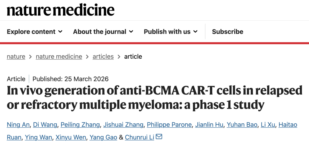 2026 年 3 月 25 日,华中科技大学同济医学院附属同济医院李春蕊教授团队在国际顶尖医学期刊 Nature Medicine 上发表了题为:In vivo generation of anti-BCMA CAR-T cells in relapsed or refractory multiple myeloma: a phase 1 study 的临床研究论文。