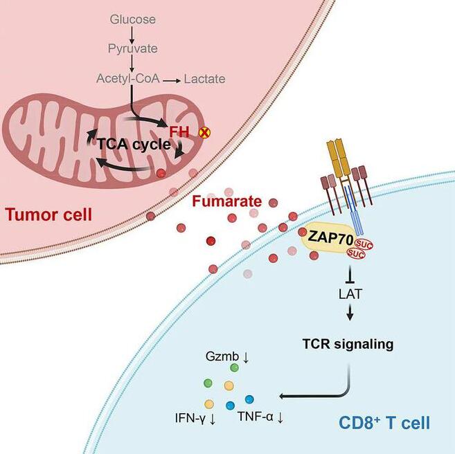 该研究报道延胡索酸水合酶(FH)缺失或失活的肿瘤细胞在肿瘤间质液中积累延胡索酸,它可以在TMECD8+T细胞中螯合ZAP70的C96和C102,并导致CD8+T细胞活化和对恶性细胞的免疫反应的阻断。在临床前模型中,FH的上调可提高嵌合抗原受体T (CAR - T)细胞在体内和体外的抗肿瘤功效。这些发现揭示了肿瘤细胞源性延胡索酸盐通过浸润CD8+T细胞调节抗肿瘤免疫检测的作用,这可能对肿瘤免疫治疗具有重要的治疗意义。