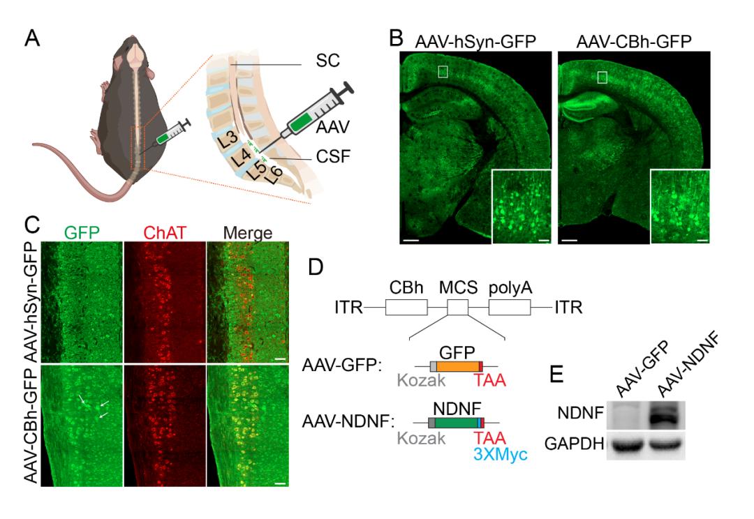 罗振革实验室长期研究神经发育与再生,在神经肌肉突触形成、神经生长与再生、及大脑皮层发育与进化领域有长期积累。经过前期探索和挖掘,研究组聚焦神经细胞源性神经营养因子NDNF,优化并构建了基于腺相关病毒AAV的NDNF表达载体,采用脊髓鞘内注射手段,实现了NDNF在脊髓及全脑的大范围神经细胞转染(图1)。
