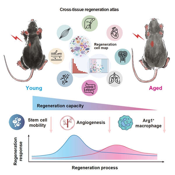10月27日,中国科学院动物研究所刘光慧研究组、曲静研究组,联合北京基因组研究所张维绮研究组,在《细胞•干细胞》(Cell Stem Cell)上,在线发表题为Decoding aging-dependent regenerative decline across tissues at single-cell resolution的研究论文。该研究通过在年轻和年老小鼠中构建八种组织器官损伤后再生修复模型,首次在单细胞分辨率系统比较了不同组织中参与再生修复过程的分子动态变化规律,揭示了干细胞响应和血管生成能力降低是年老组织再生功能障碍的关键因素,并鉴定出年轻器官强再生能力相关的巨噬细胞新亚群。该成果有助于增加科学家对增龄伴随的再生异常及器官退行规律的认知,为发展促进组织再生、延缓衰老的干预策略提供了新的线索和思路。