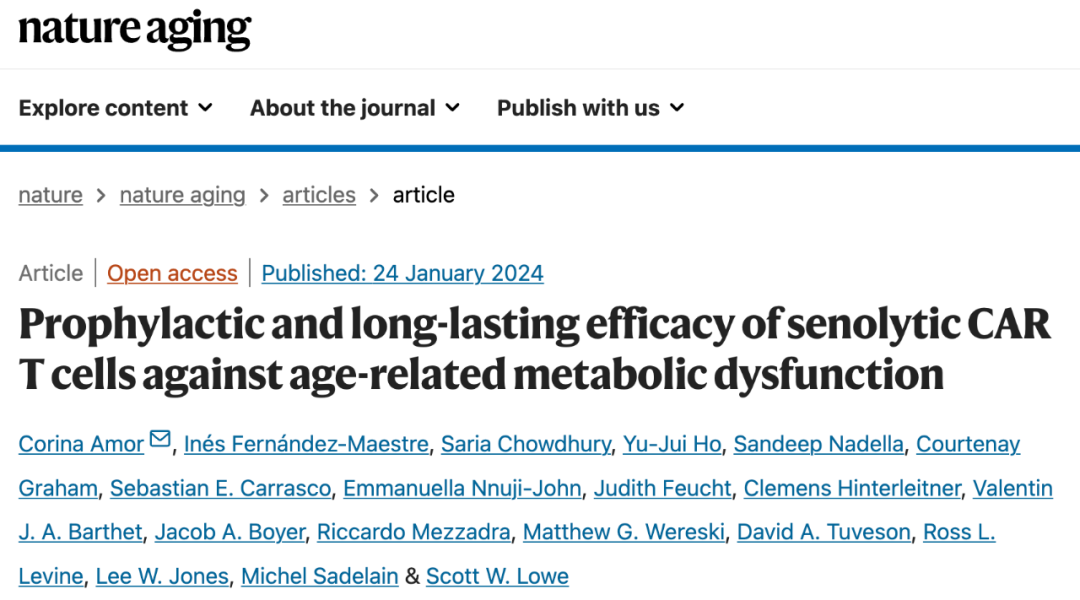 2020年6月,Corina Amor等人在Nature期刊发布了题为:Senolytic CAR-T cells reverse senescence-associated pathologies 的研究论文。