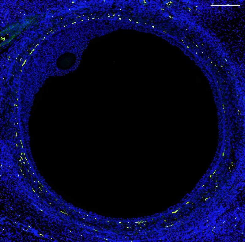 人类卵泡荧光图像清晰显示了各个不同部分,包括卵母细胞(小椭圆形)、周围的激素产生细胞、血管、免疫细胞和区室。图片来源:密歇根大学