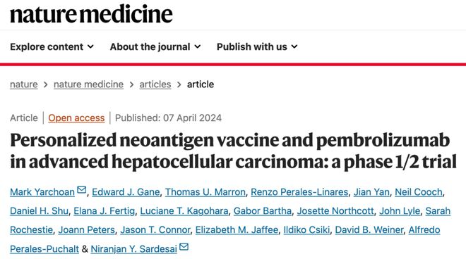 近日,GeneosTherapeutics和约翰-霍普金斯大学的研究人员在国际期刊NatureMedicine发表相关研究论文。该论文报道个性化治疗性癌症疫苗GNOS-PV02(由质粒编码至多40个肿瘤新抗原)与派姆单抗(抗PD-1单抗)联合治疗晚期肝细胞癌的1/2期临床试验结果显示,在36名既往接受过多酪氨酸激酶抑制剂(mTKI)治疗的晚期肝细胞癌患者中,客观缓解率为30.6%(11/36例),包括3名患者完全缓解和8名患者部分缓解。