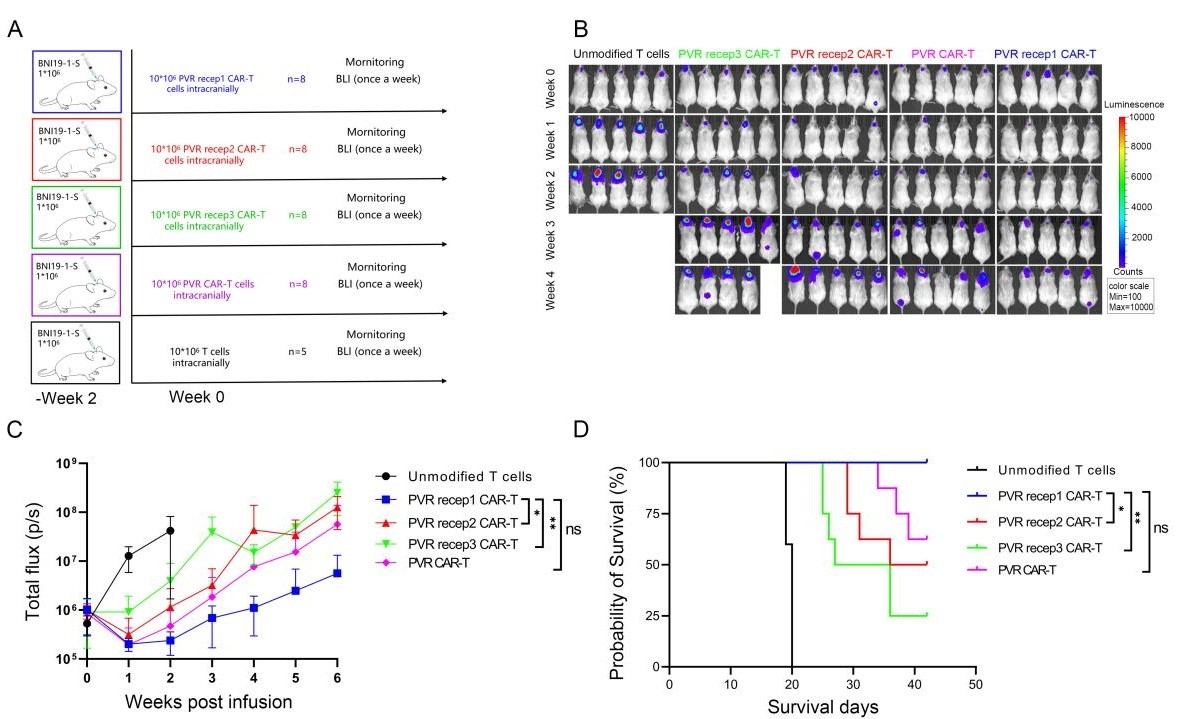 研究团队利用CGGA和TCGA数据库及胶质母细胞瘤患者样本验证了PVR可作为细胞治疗的靶点。使用慢病毒递送CAR分子,在胶质母细胞瘤免疫治疗领域,构建了国际上首个基于PVR受体的第二代嵌合抗原受体(CAR)-T细胞,并在NPG小鼠原位成瘤模型中展现了良好的抗胶质母细胞瘤的活性。