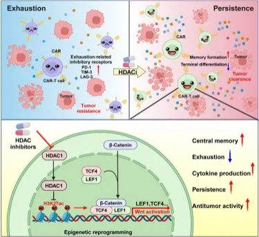 本研究,科学家们通过对染色质修饰药物的高通量筛选,将I类组蛋白脱乙酰酶抑制剂 (HDACi)鉴定为CAR-T细胞功能的增强剂,其中M344和奇达酰胺(chidamide)增强了CAR-T细胞的记忆维持和对耗竭的抵抗力,从而在体外和体内诱导持续的抗肿瘤功效。从机制上讲HDACi降低HDAC1表达并增强H3K27ac活性。来自RNA-seq、ATAC-seq和H3K27ac CUT&Tag-seq 的多组学分析表明,HDACi上调TCF4、LEF1和CTNNB1的表达,随后激活经典的Wnt/β-catenin 通路。总之,研究结果阐明了I类HDACi在增强CAR-T细胞功能中的功能作用,为CAR-T细胞治疗与HDACi治疗的协同组合提供了基础和治疗靶点。