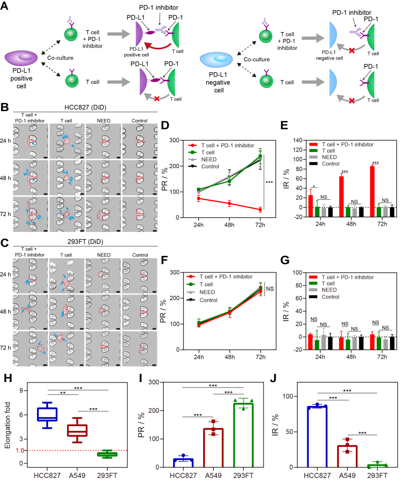 为了实现活CTCs内PD-L1基因的量化分析,研究者们设计了一种具有四面体结构的DNA探针,具有良好的特异性。完成基因检测的CTCs,保持了良好的活性,通过与免疫T细胞的共培养,研究者们发现,部分肿瘤细胞在免疫抑制剂存在时,细胞形态发生了明显的变长,且细胞增殖行为被显著抑制(图2)。根据肿瘤细胞PD-L1的表达情况,研究者们划分出了PD-L1高表达与低表达的阈值;另外,根据肿瘤细胞与免疫细胞共培养的结果,研究者们划分出了肿瘤细胞形态发生变化的阈值。综合CTCs中PD-L1高表达(PD-L1high)且表型发生变化(PA+)的占比,该研究定义了一种新的指标,“NICHE指数”,用于预测癌症患者响应免疫疗法的疗效。