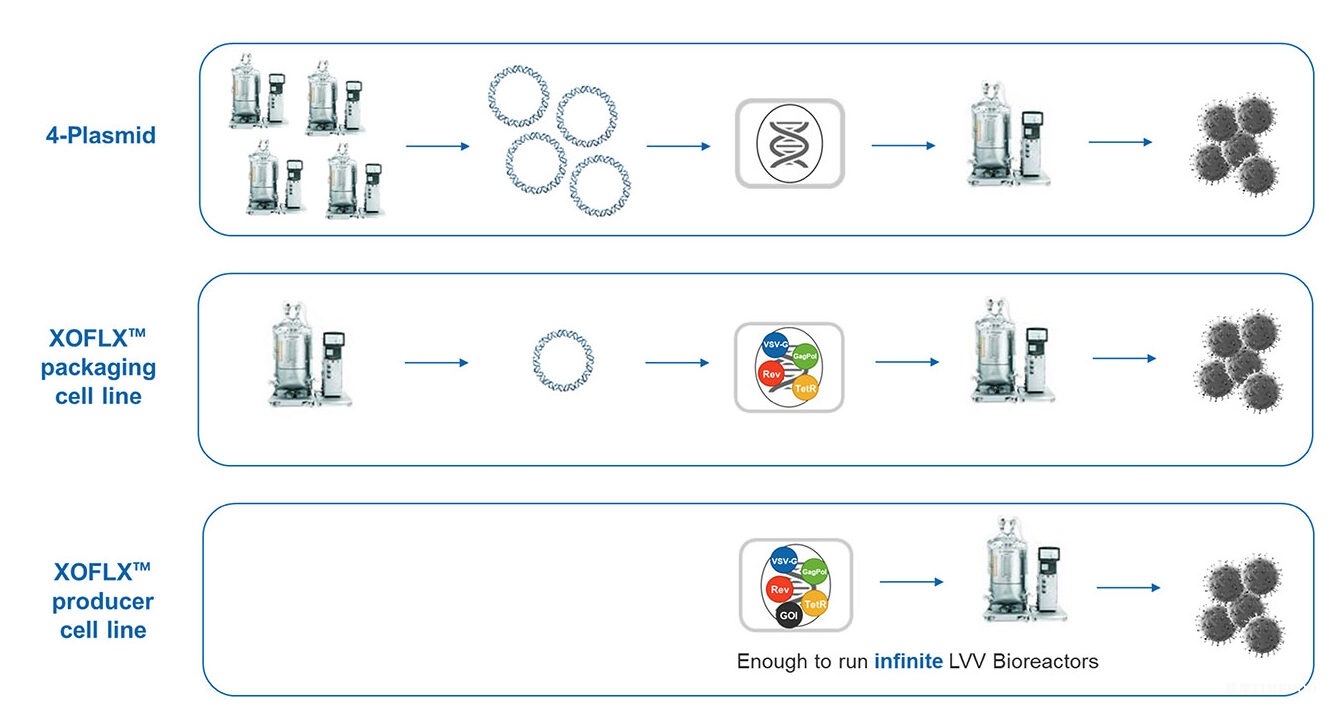 “LVV生产的行业标准是使用四种质粒——包含目标基因的转移载体、两个包装质粒和一个包膜质粒,”Liu指出。“我们通过XOFLX系统首先开发了一种包装细胞系,该细胞系将所有LVV包装元素稳定整合到细胞基因组中,仅需一个转移质粒即可进行LVV生产。此外,我们还开发了XOFLX生产细胞系,这些细胞系还整合了包含治疗基因的LVV基因组,允许无转染的LVV生产。”