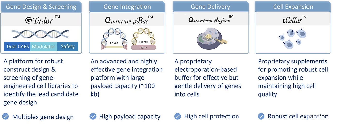 GenomeFrontier Therapeutics 整合了四个平台:G-Tailor、Quantum pBac、Quantum Nufect 和 iCellar,分别用于改进基因设计、治疗基因整合、基因传递和细胞扩增能力。这些平台共同构成了 Quantum Engine,旨在生产无病毒细胞和基因治疗产品。