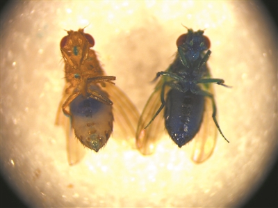 研究团队用蓝色染料追踪果蝇的肠道健康状况,因衰老而受损的果蝇肠道会渗出蓝色染料。这张图片左侧是HRJD基因改造的果蝇,右侧是同龄的未改造果蝇。图片来源:东京大学