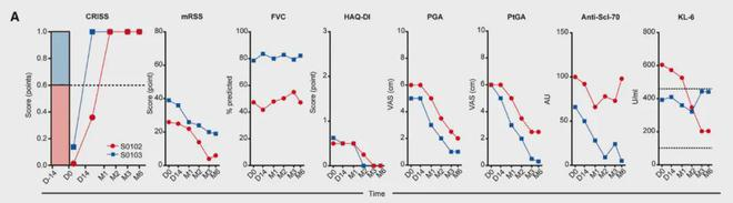 治疗两个月后,这名免疫介导的坏死性肌病(IMNM)女性患者达到了完全缓解,并在6个月的随访中 保持了完全缓解状态,且 表现出明显的临床改善,其 自身抗体已降至检测不到的水平,肌肉力量和活动能力也得到了显著改善。这两名弥漫性皮肤系统性硬化症(dcSSc) 男性患者的症状同样得到了显著改善 ,包括器官纤维化损伤的逆转, 以及自身抗体水平的下降 。