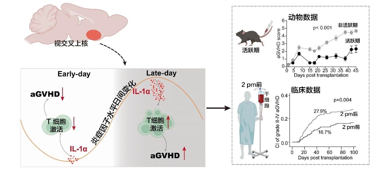 研究团队结合动物实验结果与临床数据分析,精准锁定大脑节律中枢与免疫微环境在其中的核心作用机制,首次揭示了造血干细胞移植过程中,干细胞输注时间与移植后急性移植物抗宿主病发生率及严重程度之间的关联。这一发现为临床预防急性移植物抗宿主病开辟了一条崭新路径,在临床应用中具有重要价值,并进一步提示药物研发时评估相关药物疗效,应注意移植节律时间这一关键因素。